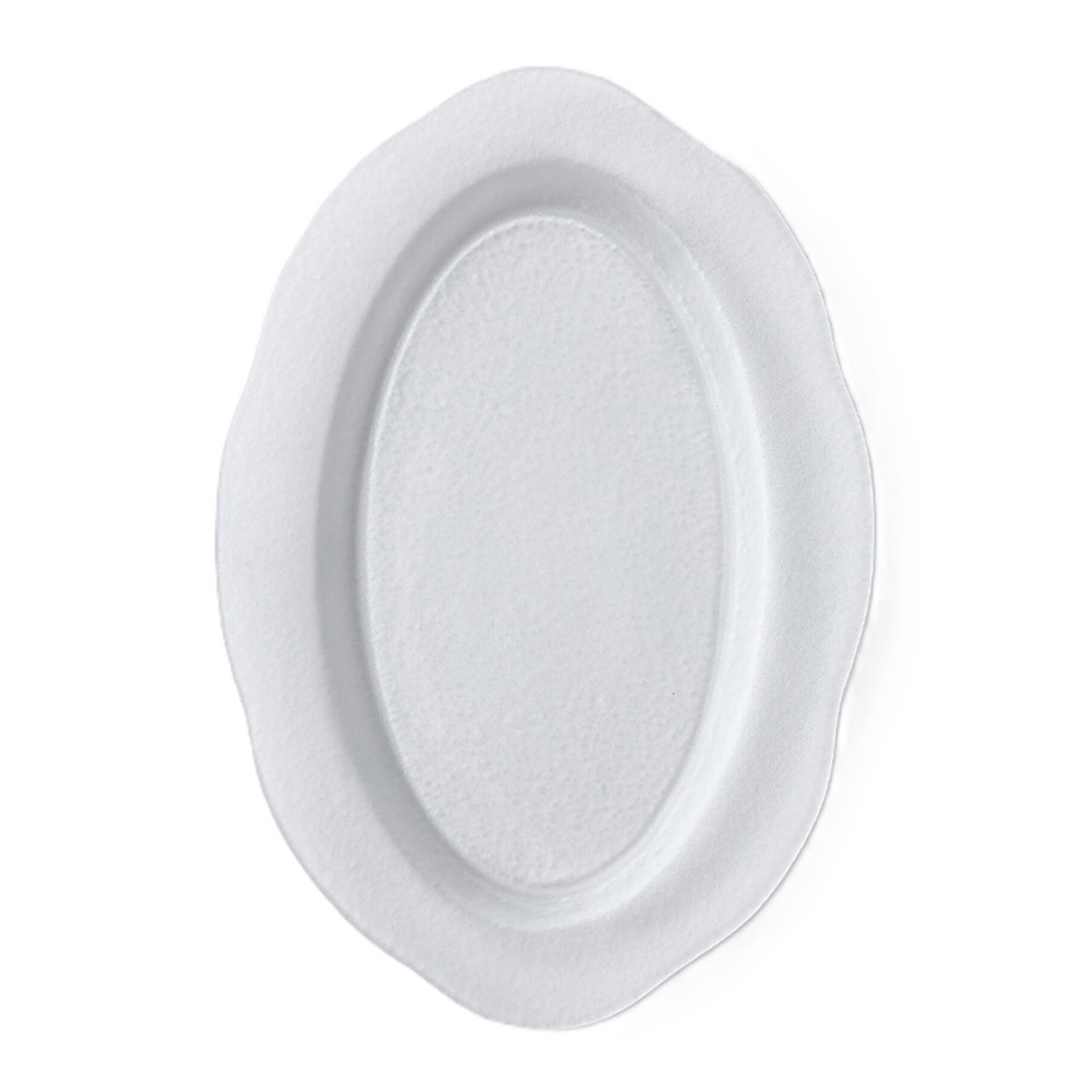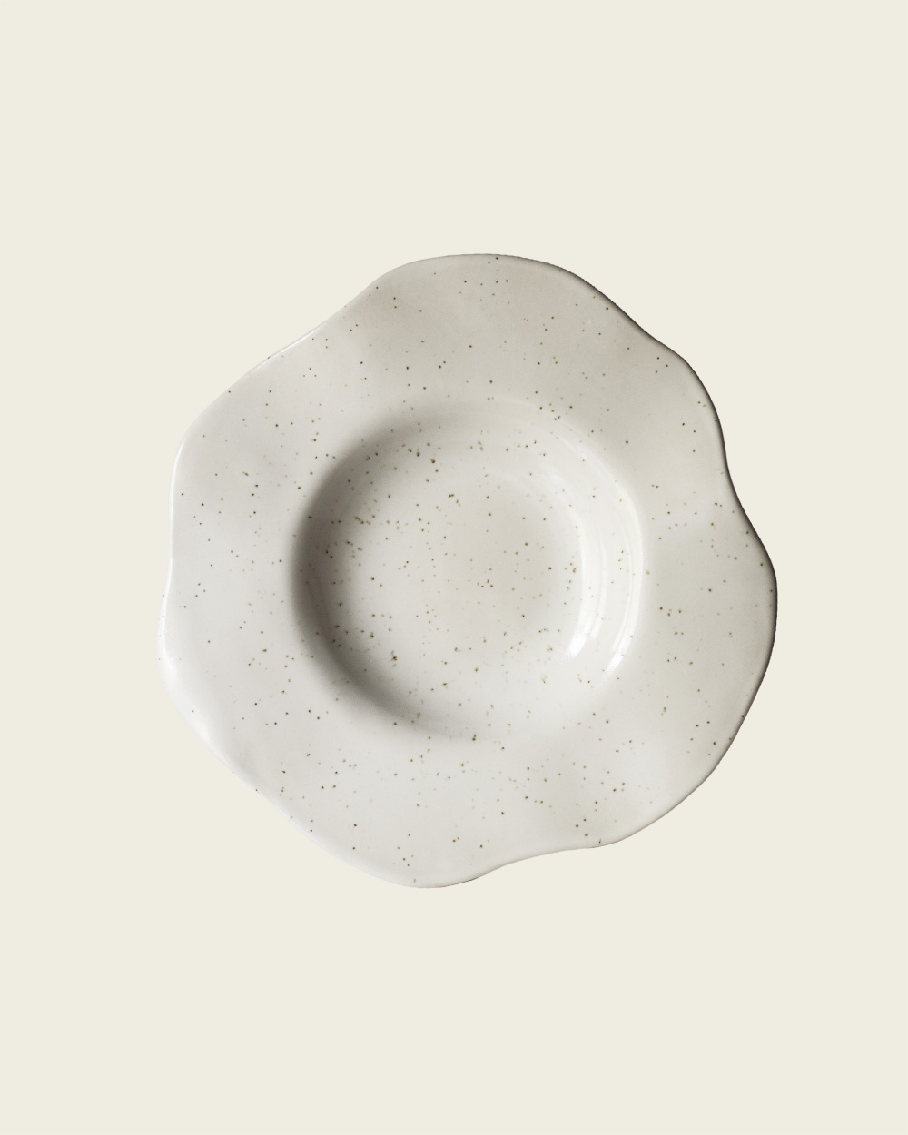 Керамическое блюдо с неровным краем, напоминающим очертания цветка.