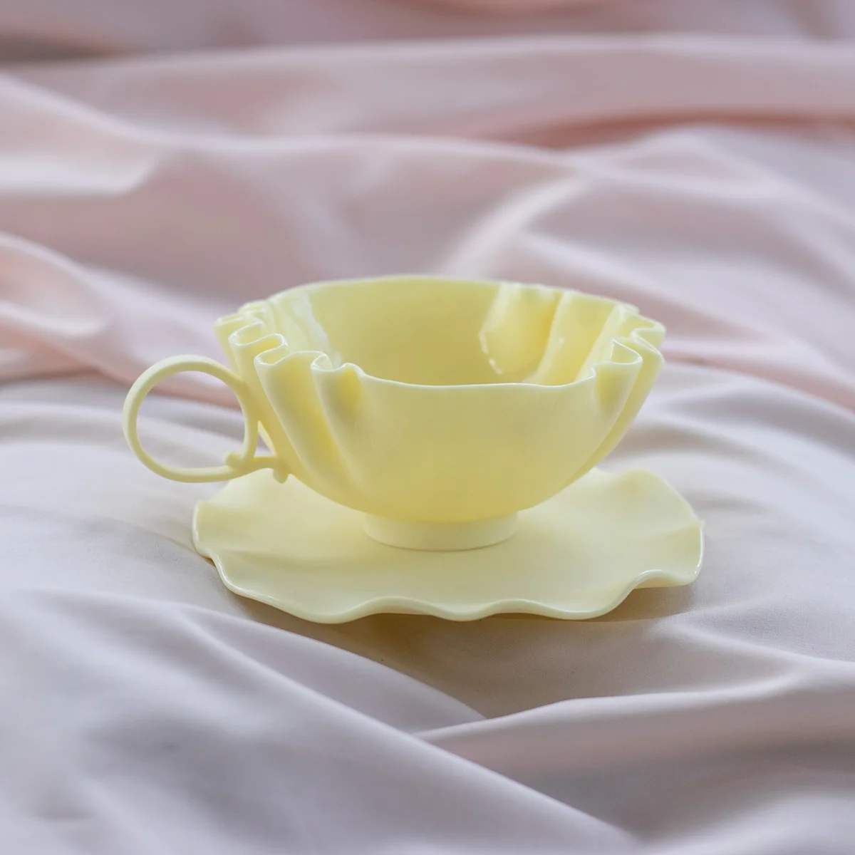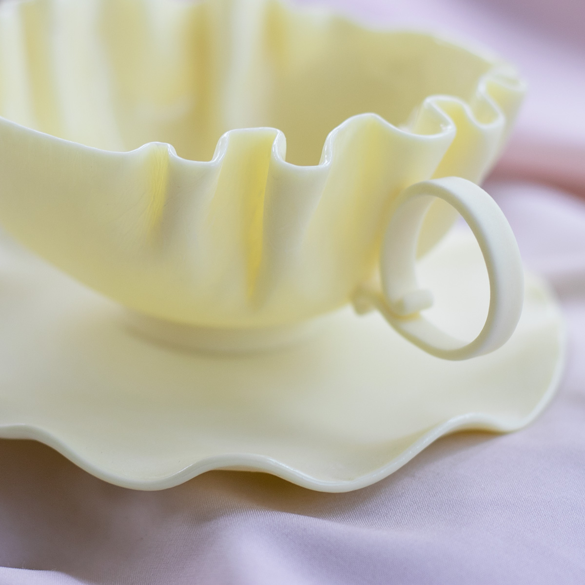 Создается полностью вручную – каждая пара имеет индивидуальный рисунок складок, изгиб ручки и форму блюдца, но общая форма остаётся одинаковой.