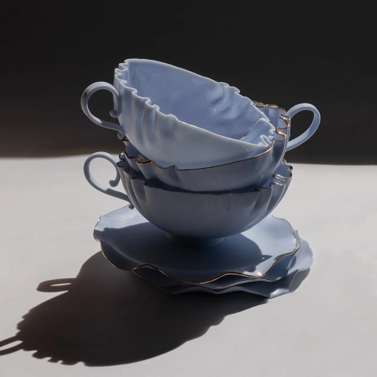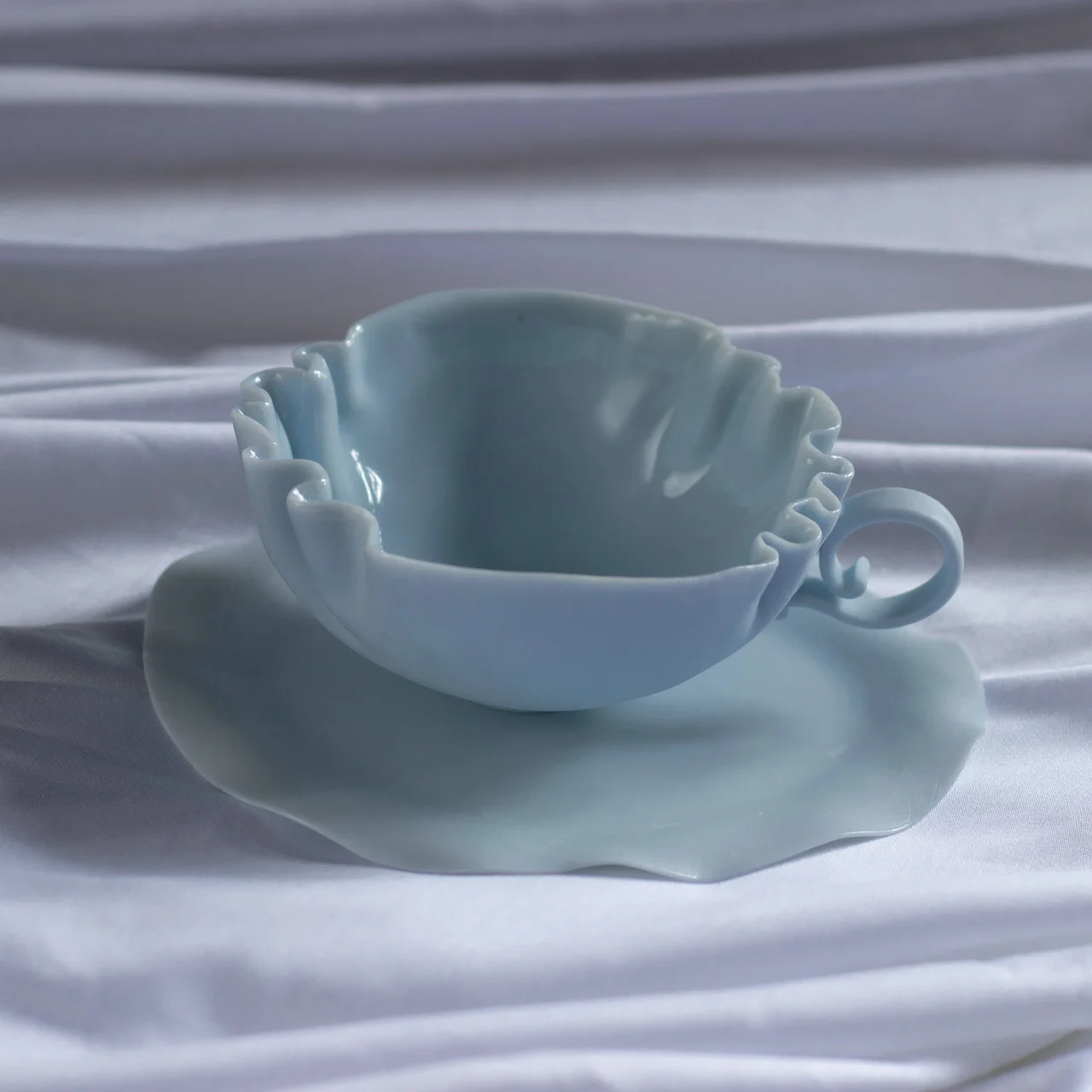 Создается полностью вручную – каждая пара имеет индивидуальный рисунок складок, изгиб ручки и форму блюдца, но общая форма остаётся одинаковой.