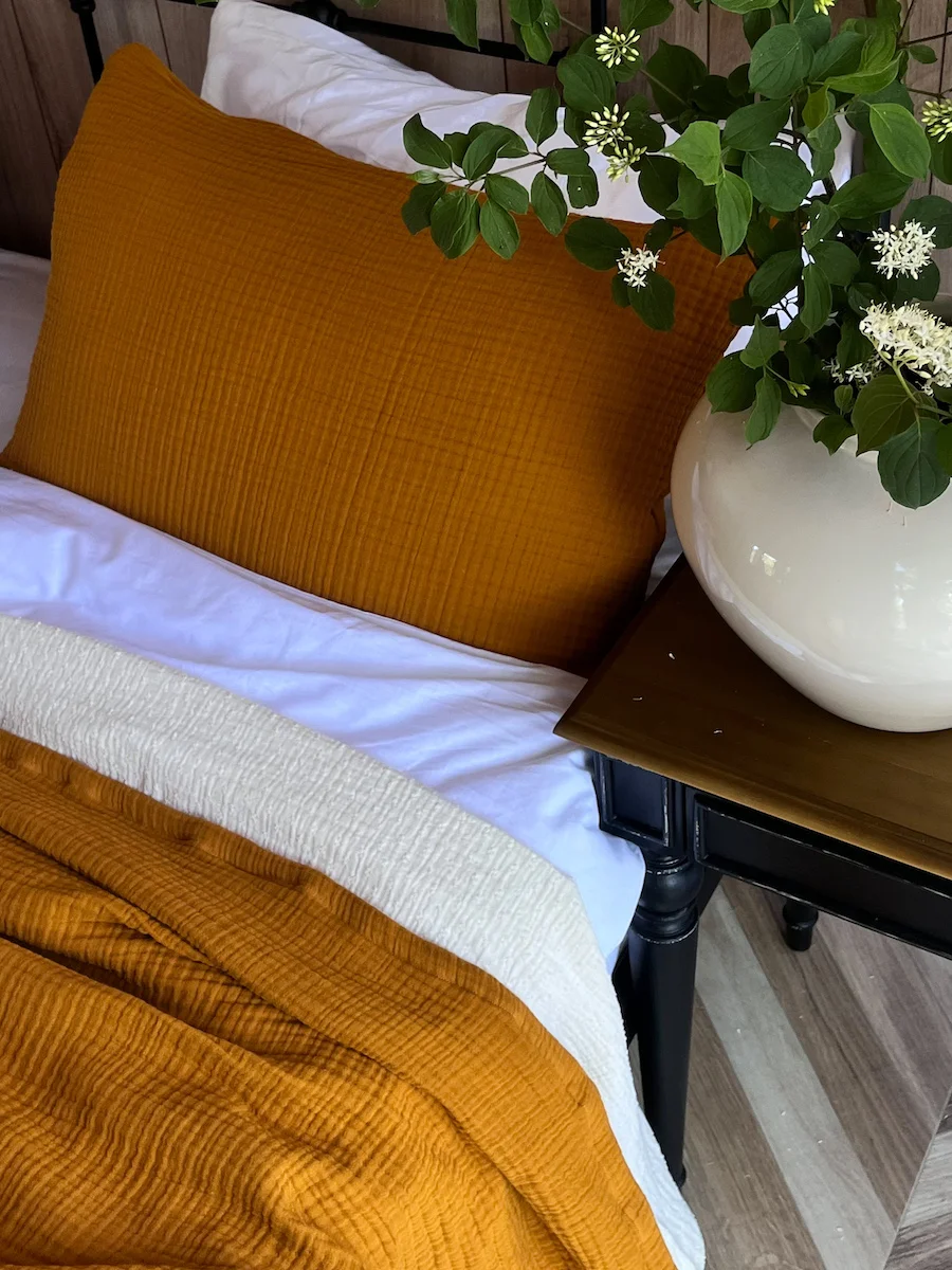 Наволочка закрывается на потайную, абсолютно незаметную молнию. Ярко выраженная текстура муслиновой ткани станет отличным поводом использовать наволочку не только для сна, но и как декоративную.