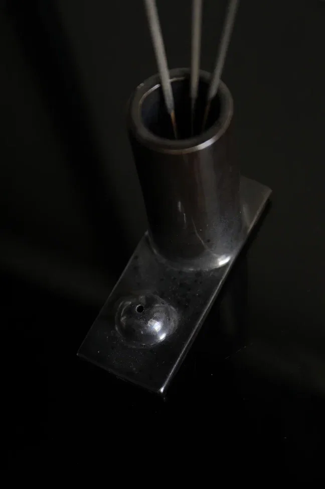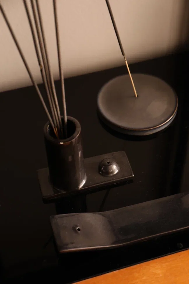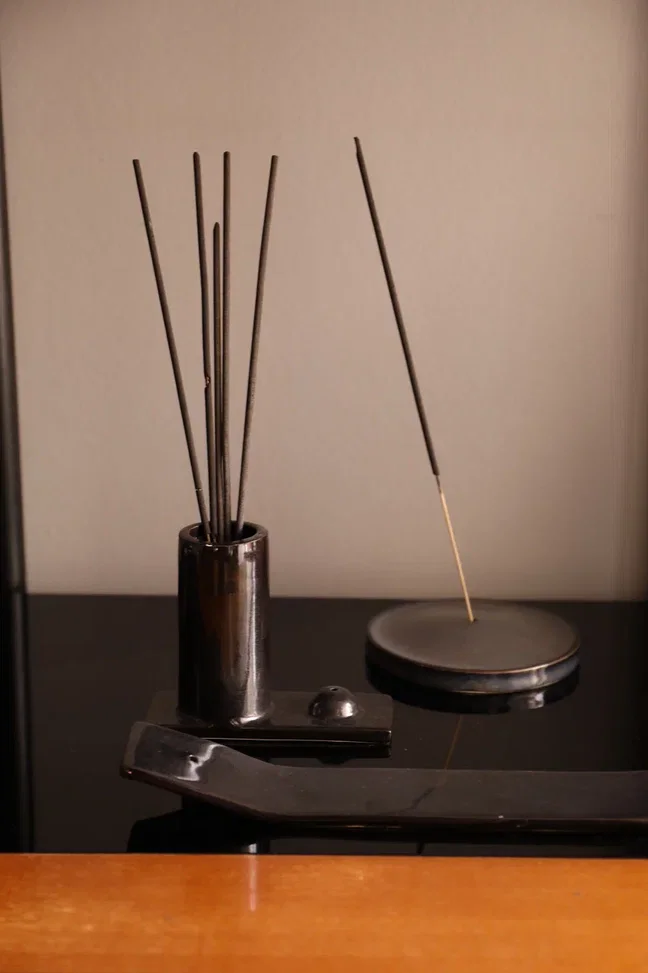 Подставка vase состоит из двух частей . Одна часть предназначена для поджигания ароматический палочек, а другая для их хранения. Выполнена она из керамики ручной работы и покрыта черной матовой глазурью. Благовония в вазе для хранения будут ароматизировать помещение даже в незажженном виде.