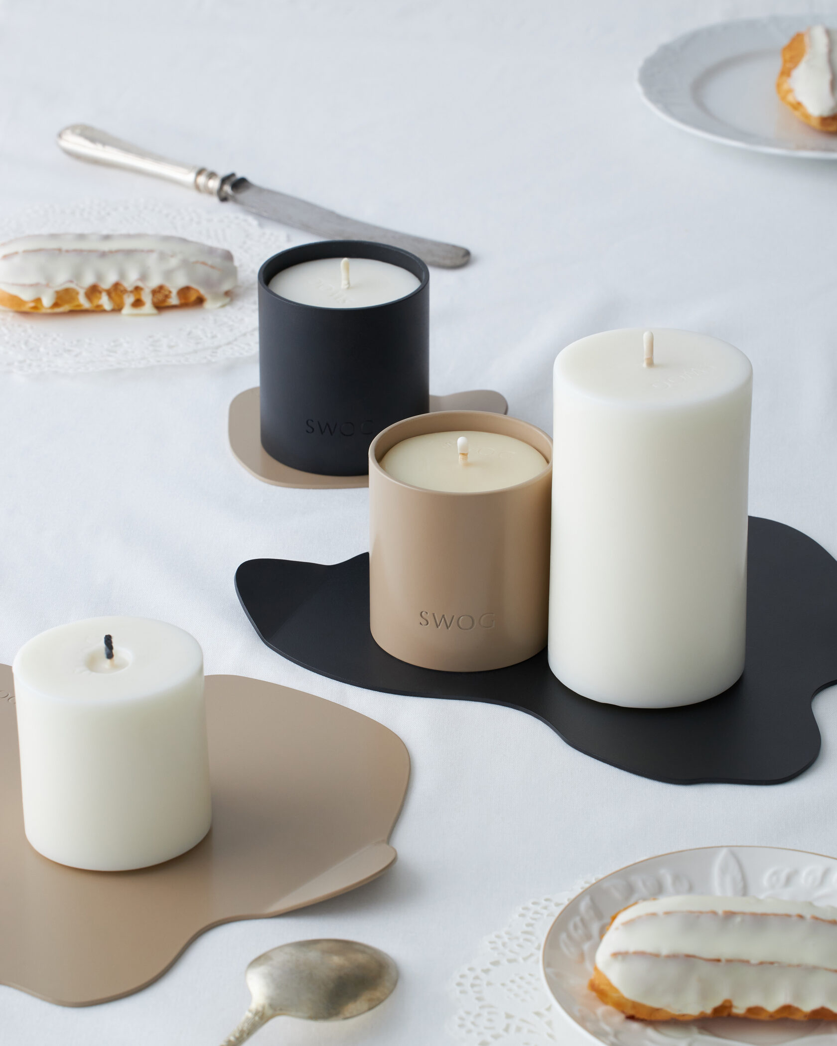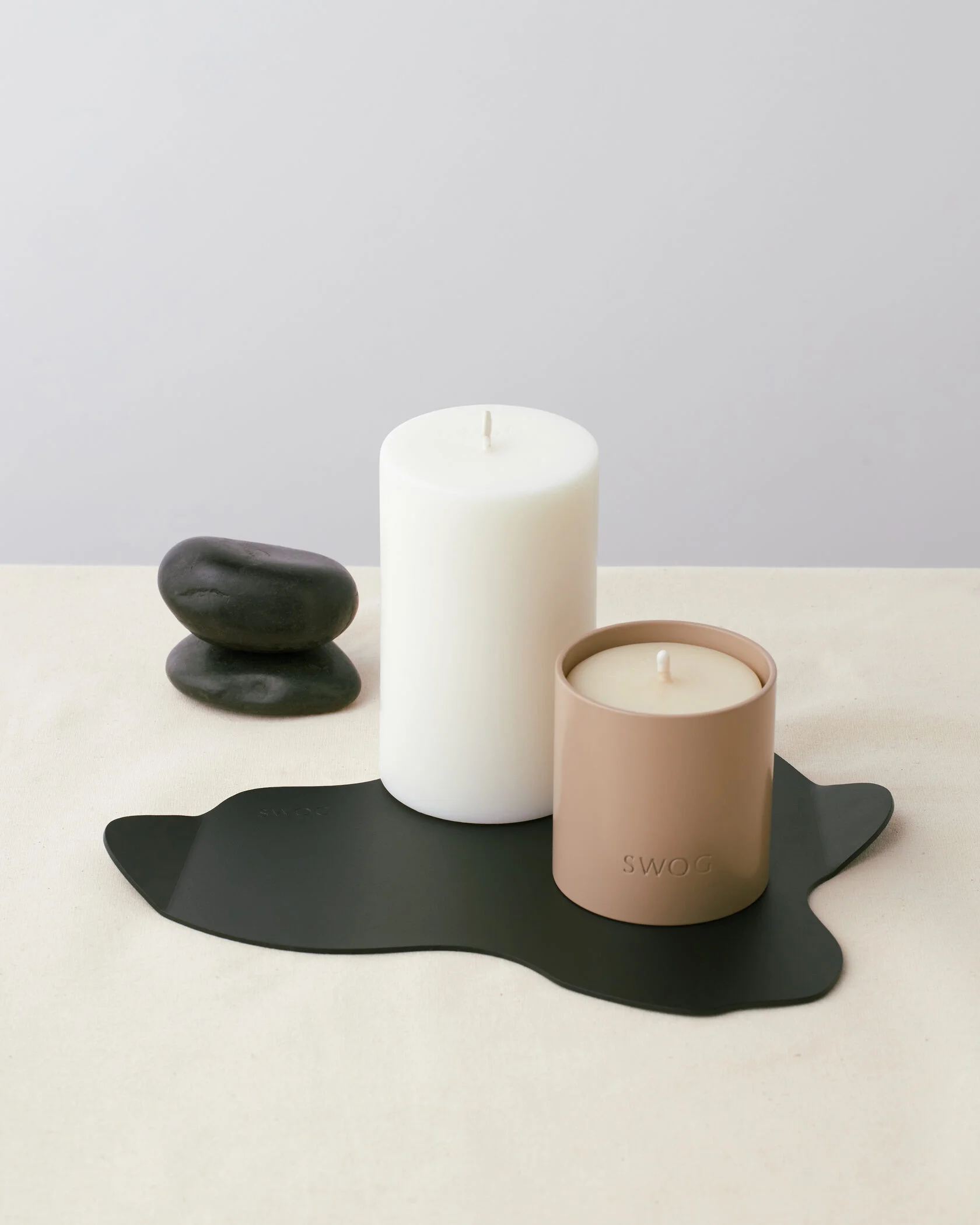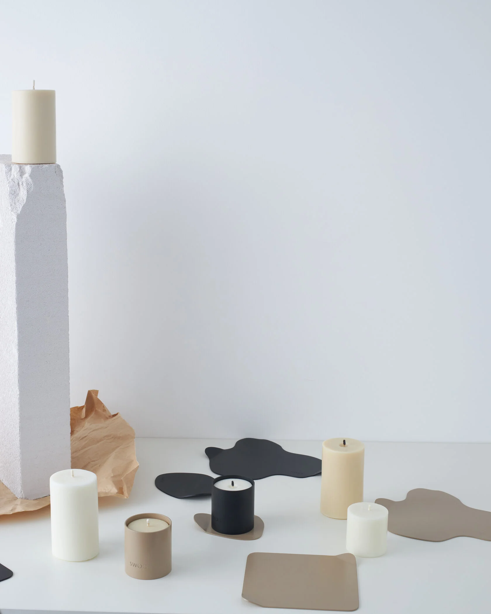 Вдохновением для новой коллекции SWOG living стал случайно застывший воск от свечи во время рабочего процесса, который принял форму овальных вытянутых форм. Незатейливым методом дальнейшего формообразования мы получили несколько основных фигур, которые стали полноценной коллекцией подставок под свечи.