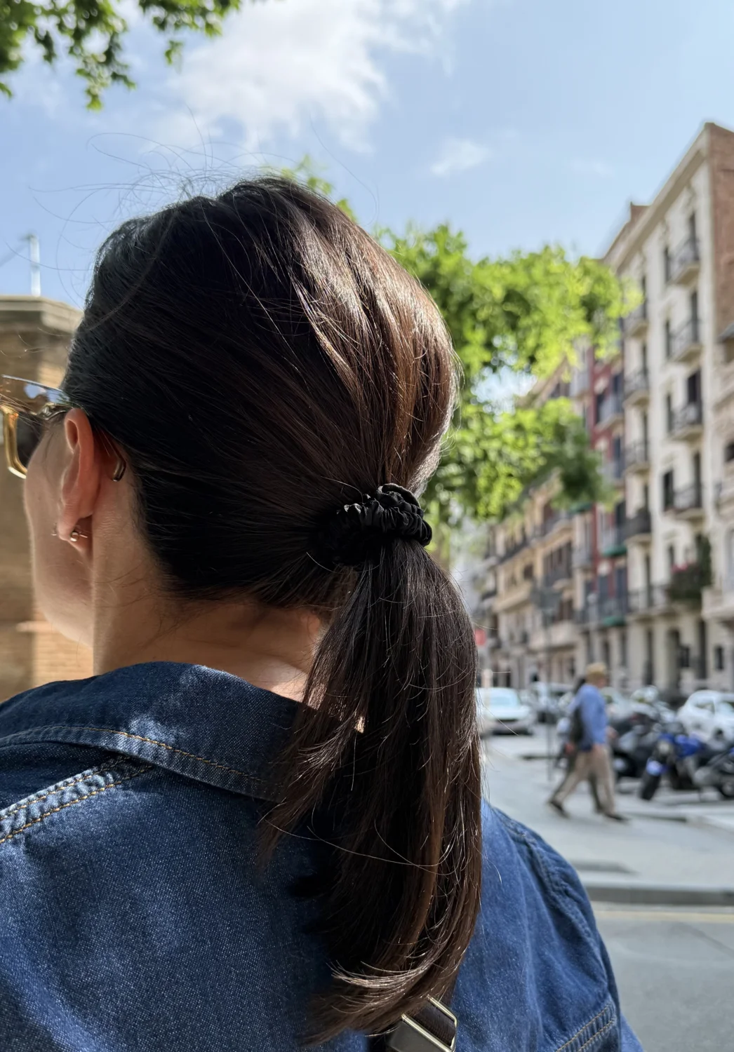 Черная резинка в качестве акцентного аксессуара — простой и быстрый в исполнении style trick для образов на каждый день.