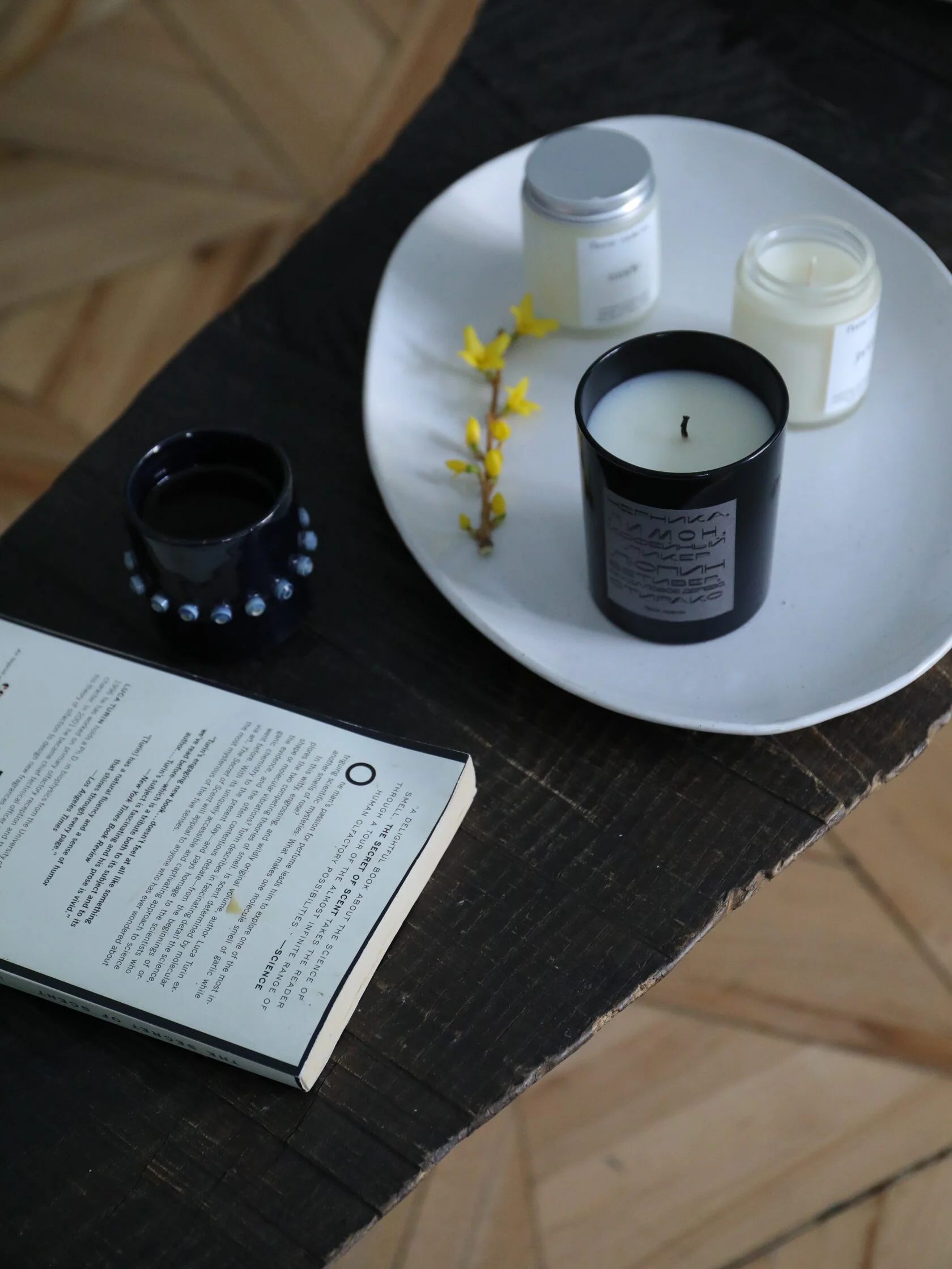 Свеча залита в глянцевое черное стекло и упакована в аккуратный тубус.