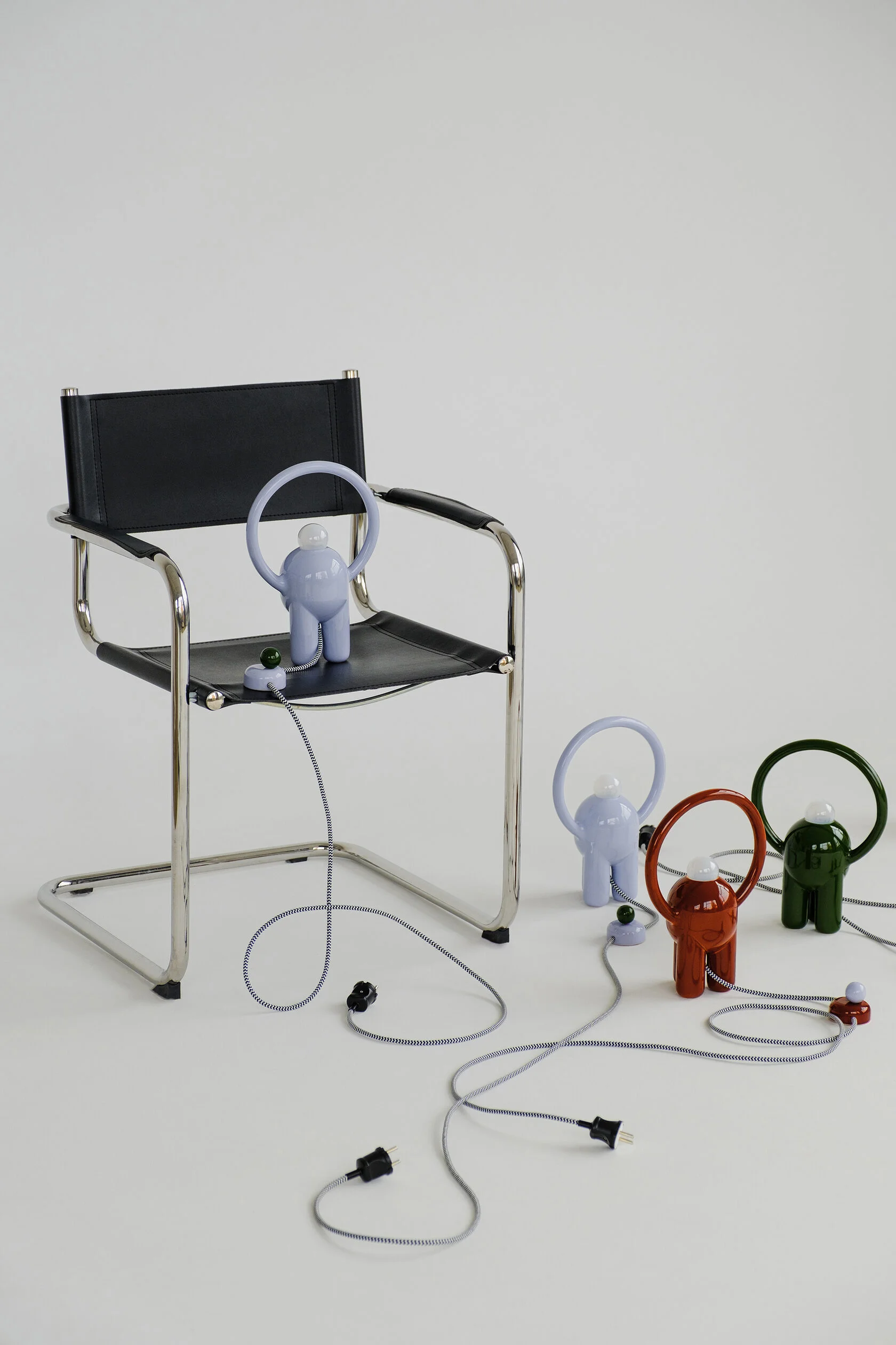 Лампа опирается на три устойчивые ножки — именно эта конструкция легла в основу её имени. Скульптурная композиция дополнена округлой лампой накаливания с тёплым свечением, создающей мягкую атмосферу в пространстве. Диммер позволяет тонко настраивать уровень яркость освещения, при этом остается отдельным визуальным акцентом благодаря сочетанию чистых форм.