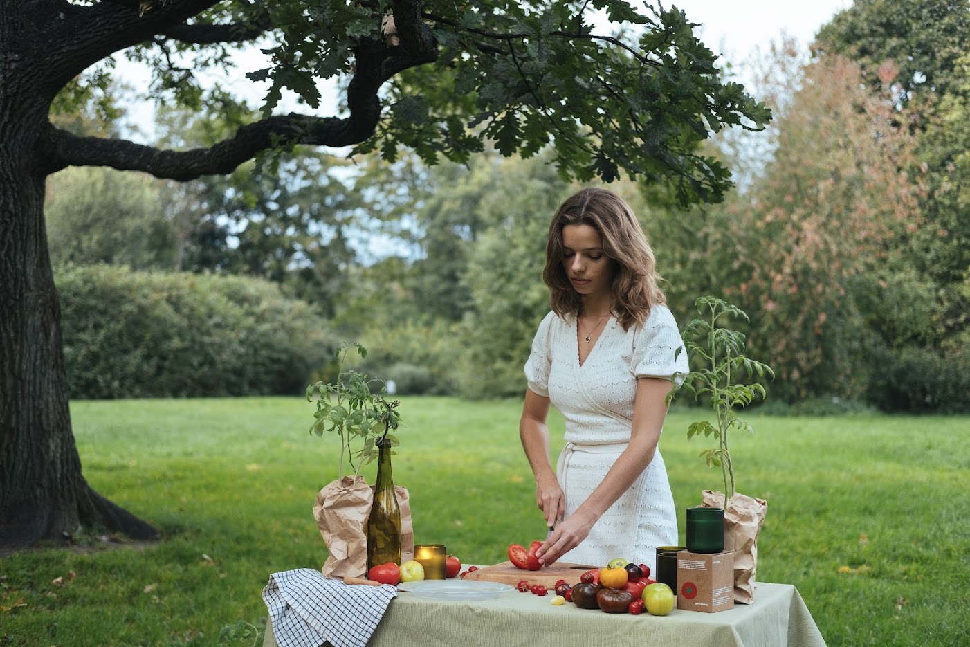 Терпкость томатных листьев и запах нагретого солнцем плода в матовом стакане Re. Свеча создана локальным брендом Sp.Candle. Коробка свечи изготовлена из перерабатываемого сырья, наполнитель — из древесной стружки. Стаканы для свечи Solid Water производят из переработанных винных бутылок, обработанных особым образом.