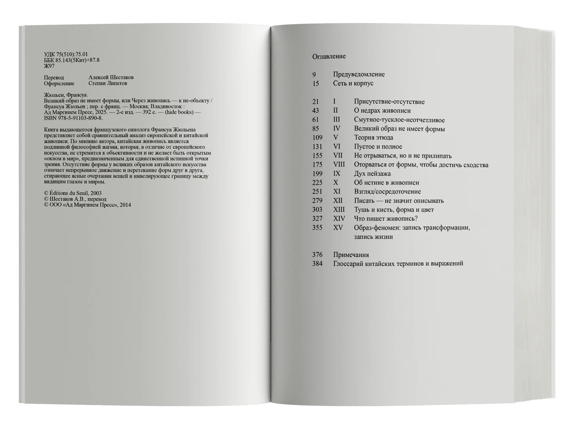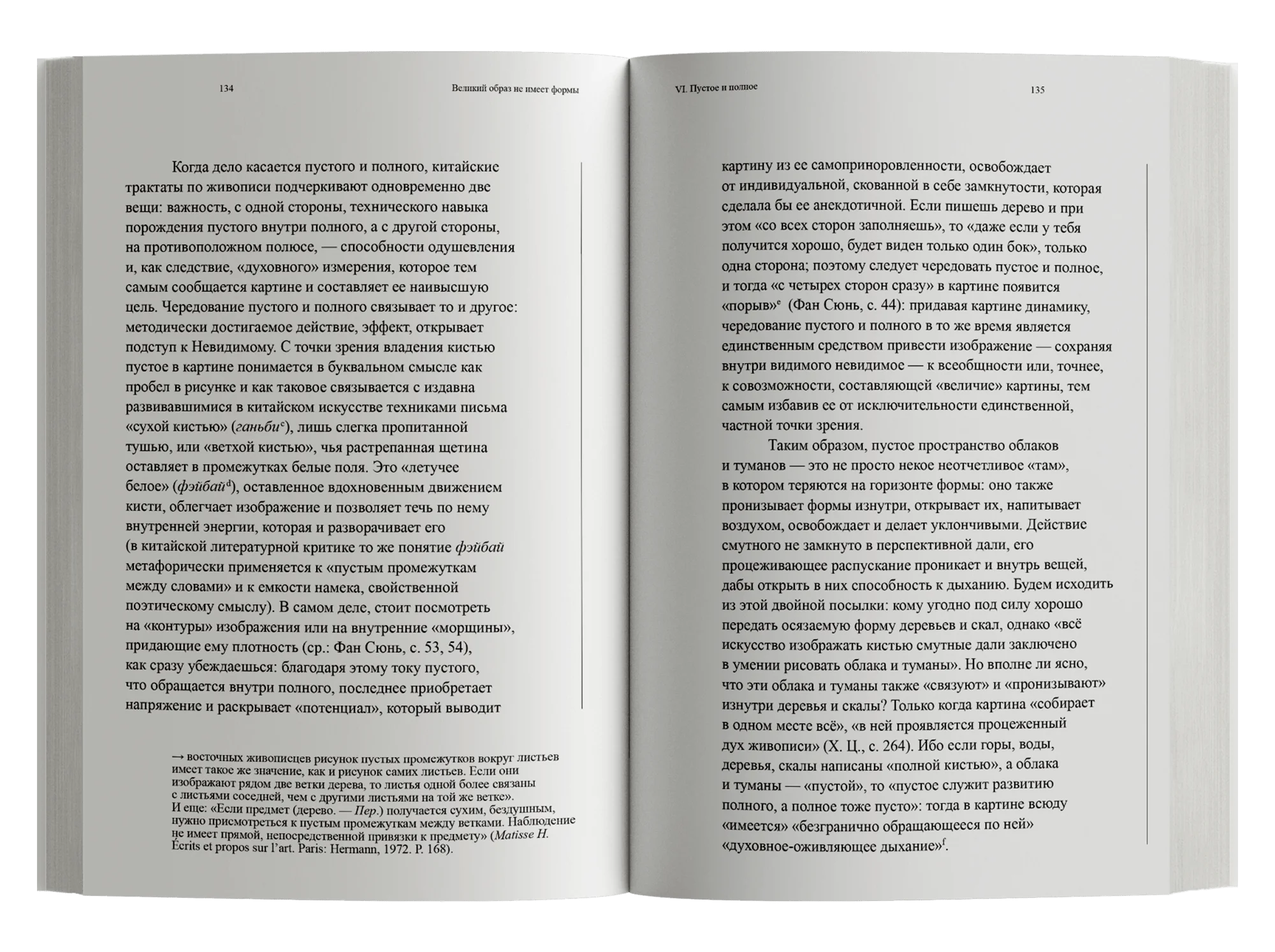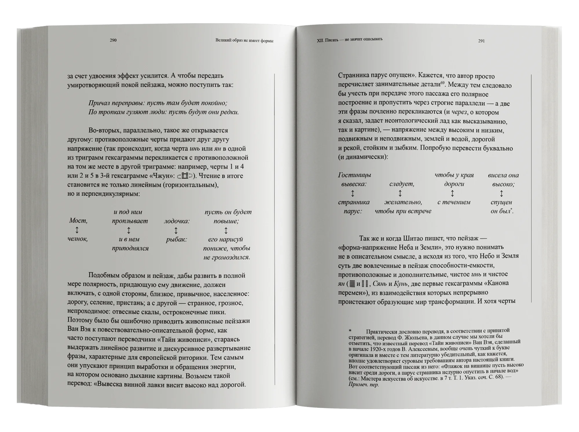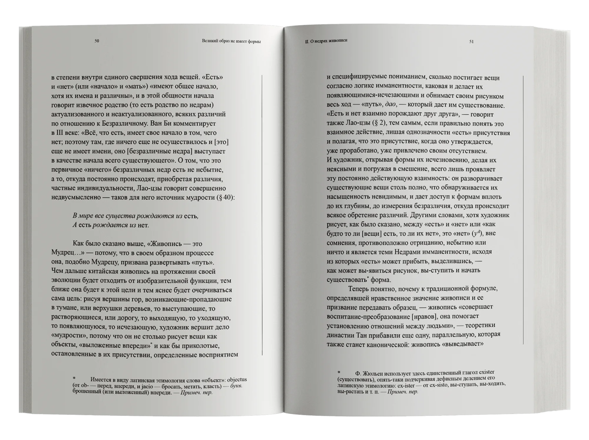 Книга выдающегося французского синолога Франсуа Жюльена, профессора философии Сорбонны и директора Института Марселя Гране, представляет собой сравнительный анализ европейской и китайской живописи. По мнению автора, китайская живопись является подлинной философией жизни, которая, в отличие от европейского искусства, не стремится к объективности и не желает быть открытым «окном в мир», предназначенным для единственной истинной точки зрения. Отсутствие формы у великих образов китайского искусства означает непрерывное движение и перетекание форм друг в друга, стирающее ясные очертания вещей и нивелирующее границу между видящим глазом и миром.