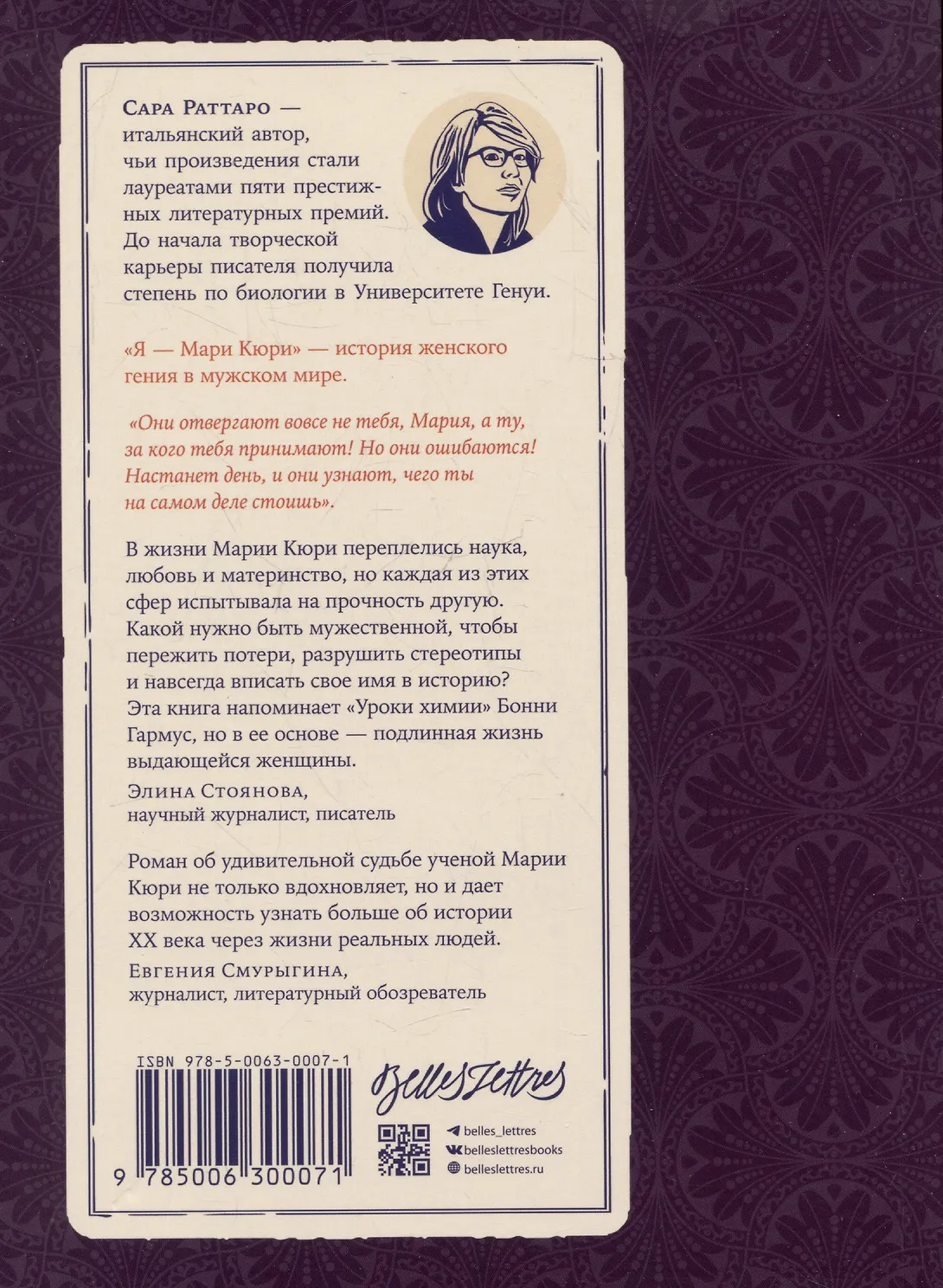 Сара Раттаро дает слово самой ученой. Страницы романа — ​словно ее дневник, полный сокровенных мыслей и надежд. Мари проходит долгий и тернистый путь от подпольного университета до получения двух Нобелевских премий, сталкиваясь с гендерными предрассудками и преодолевая последствия публичных скандалов. Она разрушает стереотипы — ​как в науке, так и в жизни, — ​оставаясь искренней, невероятно смелой и упорной. «Я — ​Мари Кюри» — ​история женского гения в мужском мире.